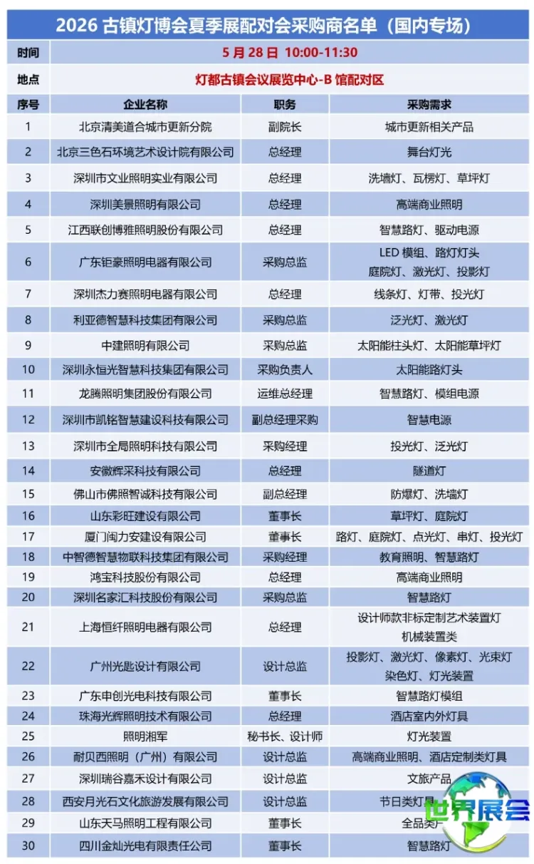 今天为大家揭秘的是5月28日国内专场的首批信息,活动特邀文旅夜游、智慧工程、商业照明、城市更新等领域的优质采购商,齐聚灯都古镇会议展览中心B馆配对区,到场采购商均为企业核心决策者,具备清晰的采购计划和明确的合作需求。部分重点采购商信息如下: