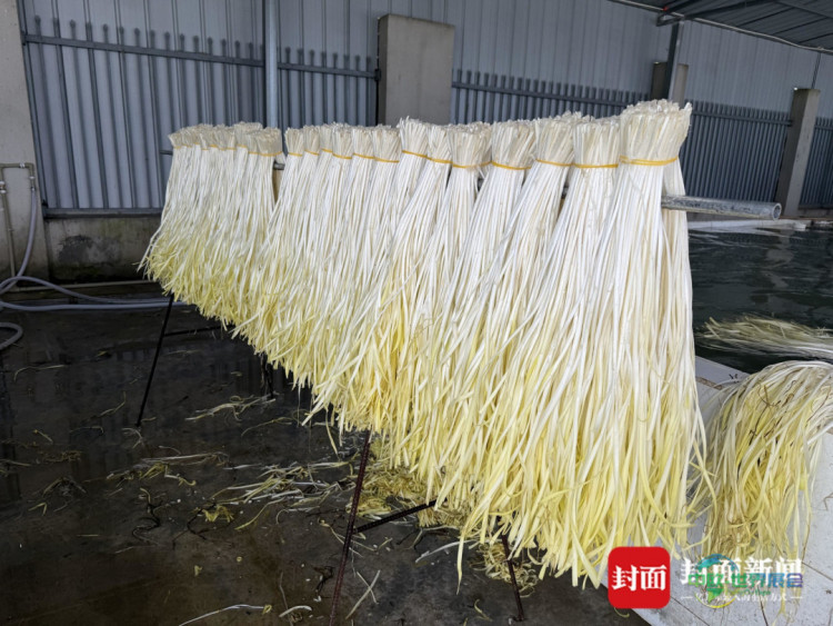 干撕完成后,韭黄会被送入清洗池清洁,随后立刻送到晾晒场控水。一排排架子上,处理干净的韭黄被整齐悬挂,嫩黄的茎叶在通风处自然沥干表面水分,这就是第二、三道工序:清洗和晾晒。