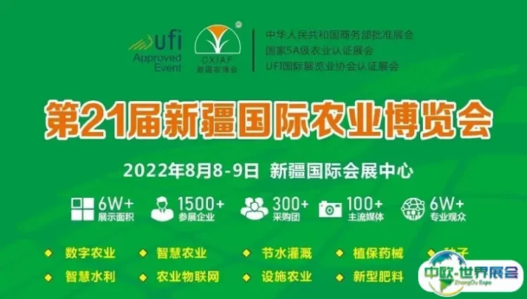 经商务部批准、国家5A级农业认证、UFI全球展览业协会认证的第21届新疆农业博览会将于2022年8月8-9日在新疆国际会展中心举办。