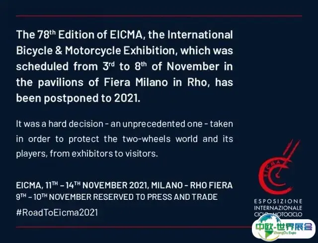 受Covid-19新冠疫情严重影响,EICMA主办方不得已作出艰难的决定,取消2020年米兰车展活动,将第七十八届EICMA会期延至2021年11月11日至14日举行。