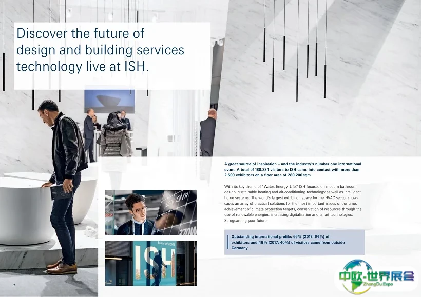 德国法兰克福暖通制冷展-法兰克福卫浴展(ISH)是全球卫生洁具及供热产业最大、最知名的展览会。展示了世界最先进的浴室,是建筑创新理念不可或缺的重要舞台。不仅给生产厂家以及贸易观众更多的展会机会,还吸引了大量建筑设计师、工程师以及相关行业专家和学者。所有有关建筑物系统的技术都越来越注重遵循新的节能、保护资源的规则。