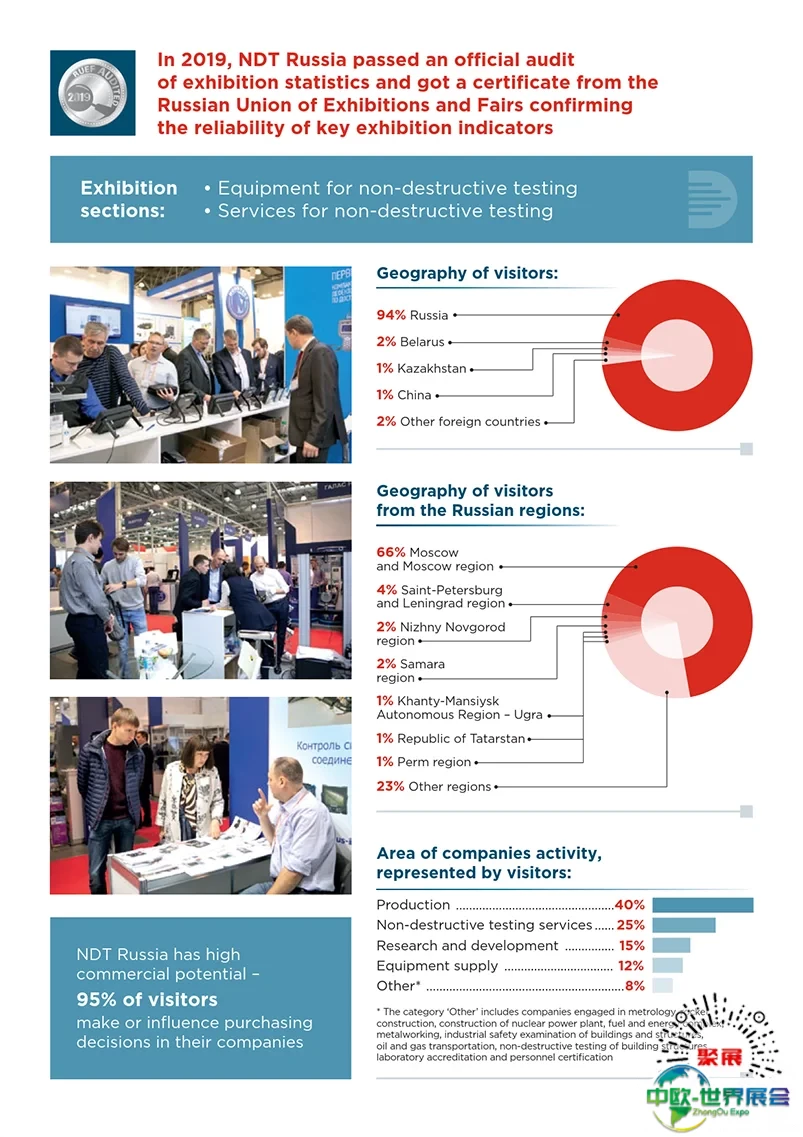 俄罗斯莫斯科无损检测设备及技术诊断展NDT Russia上届展会总面积10000平方米,参展企业200家均来自中国、日本、波兰、迪拜、美国、新加坡、巴西、中国香港等,参展人数达8673人。中国展团在此届展会上也取得非常优秀的展出效果。
