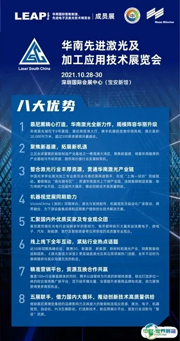 作为LEAP Expo2021成员展,华南先进激光及加工应用技术展览会(华南激光展)将与慕尼黑华南电子展、慕尼黑华南电子生产设备展、华南电路板国际贸易采购博览会和VisionChina(深圳)同期举办。五展联动,面向华南地区,完整覆盖激光加工、先进光源、先进激光器、自动化及机器人、电子制造智能化解决方案、半导体与系统设计技术、电子元器件、系统及方案、线束加工及连接技术、点胶注胶设备及材料、机器视觉等核心部件和辅件及智慧工厂特色环节,联合产业优质企业,整合顶层优势资源,打造跨行业合作平台。