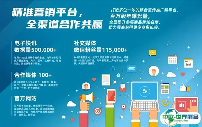 覆盖100+行业垂直媒体的同时,携手以自媒体为代表的新媒体渠道,联合打造多位一体的综合宣传推广新平台,百万级年曝光量,全面提升参展商品牌知名度,助力展商获得更多商贸机会。