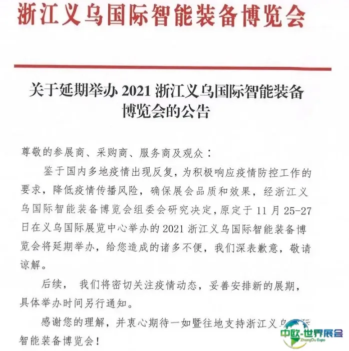 关于2021浙江义乌国际智能装备博览会延期举办的通知,展会介绍及亮点