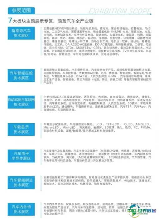 AAE 2021 展现的不仅是产品,更是技术碰撞的可能。展出范围共规划了七大主题展示专区,涵盖汽车全产业链。新产品、新技术尽览于此,轻松占领行业先机:新能源汽车技术展区、汽车智能座舱技术展区、自动驾驶与车联网技术展区、车载显示技术展区、汽车电子半导体展区、汽车智能制造技术展区、汽车内外饰技术展区。