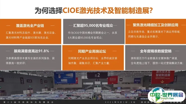 深圳激光技术及智能制造展CIOE同期举办中国光博会CIOE,紧贴市场发展,细分观众数据实现精准营销匹配资源,展示前沿智能制造技术及创新综合解决方案。覆盖光通信、激光、红外、精密光学、光电创新、军民融合、光电传感、数据中心等光电产业链版块。
