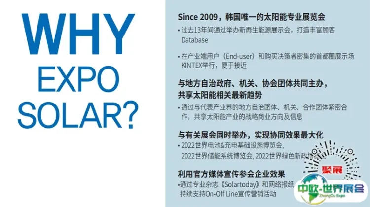 全世界太阳能产业动向与技术开发趋势的第一个国际展示会,提供一眼可以掌握当年太阳能有关产业的最佳的机会。韩国太阳能光伏及新能源展览会(EXPO SOLAR)不仅可以扩大国内市场,还为世界市场为目标的太阳能企业提供打开新事业的交流平台。