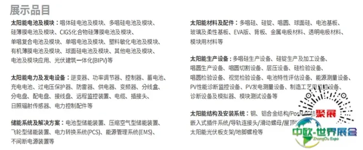 太阳能电池:晶体硅电池、模块、聚晶体硅电池、模块、硅薄膜电池、模块、CIGS化合物薄膜电池、模块、单晶复合电池、模块、多晶复合电池、模块、色素感应式电池、模块、有机薄膜电池、模块、球形硅电池、模块、其他电池