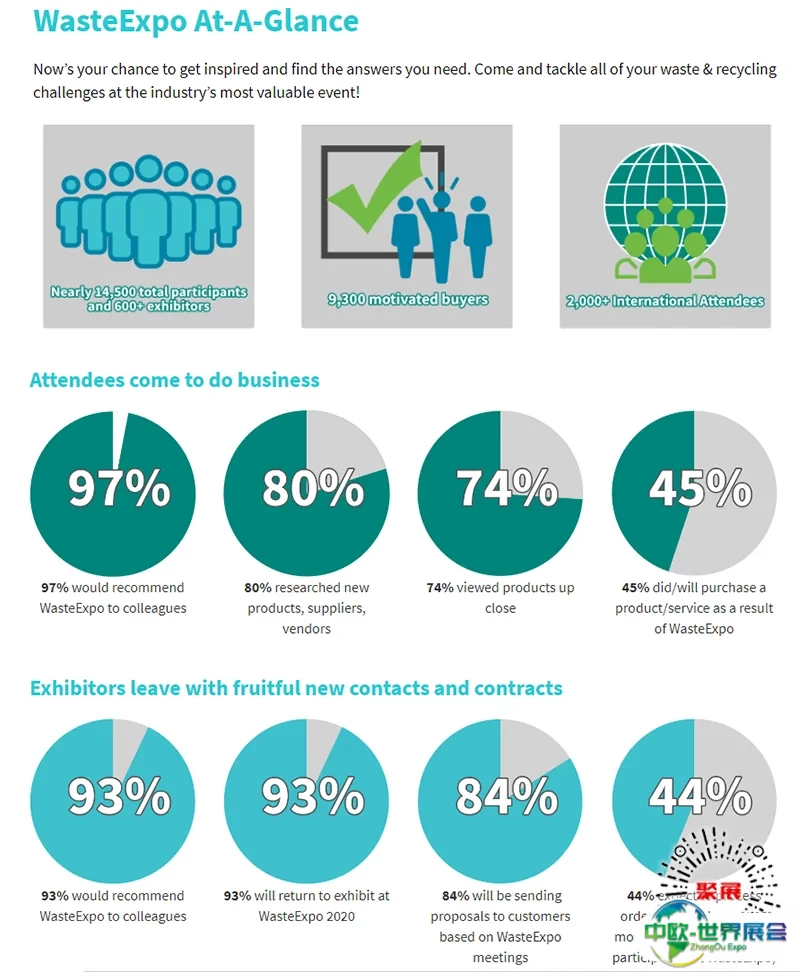 美国环保及废物处理展Waste Expo上届展会总面积23000平方米,参展企业458家均来自中国、韩国、日本、意大利、加拿大、巴西、澳大利亚、印度、俄罗斯、波兰、南非等,参展人数达20500人。