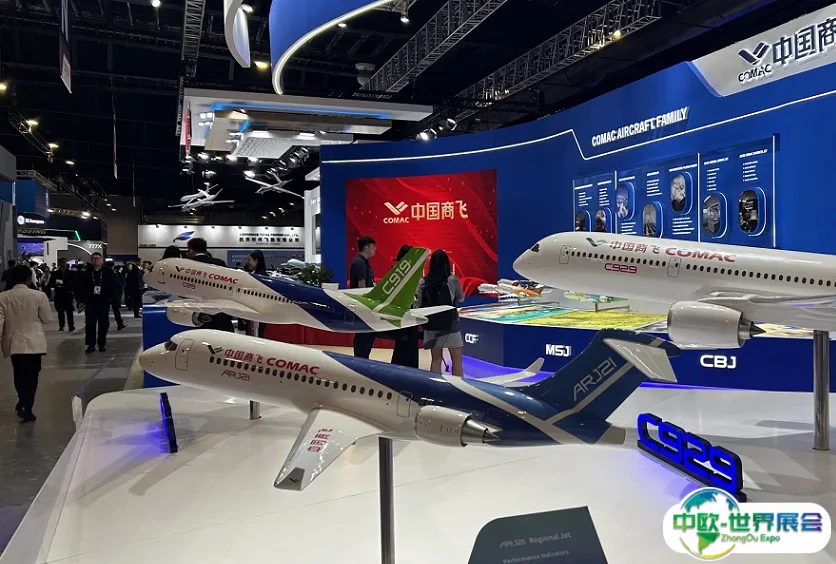 中国商飞展台则以“携手同行 共创未来”为主题,展出了最新涂装的C919、ARJ21和C929基本型飞机模型,以及ARJ21公务机、医疗机、应急救援指挥机、灭火机、货机,C919缩短型/高原型和加长型等系列化飞机模型。
