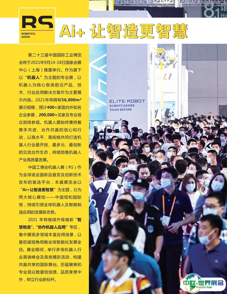 上海国际机器人展览会(RS)从2012年设立机器人展区,2013年首次独立设主题展为工业机器人展,2015年更名为机器人展,2016年首次在展内设立服务机器人体验专区和高校科研创新展示区,2017年设立“中国馆”和“国际馆”,到2018年深化“中国馆”和“国际馆”主题",已成为机器人行业风向标、持续引领行业发展新趋势。