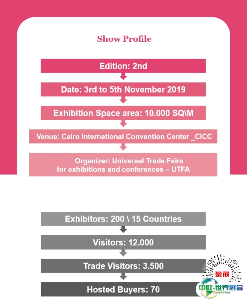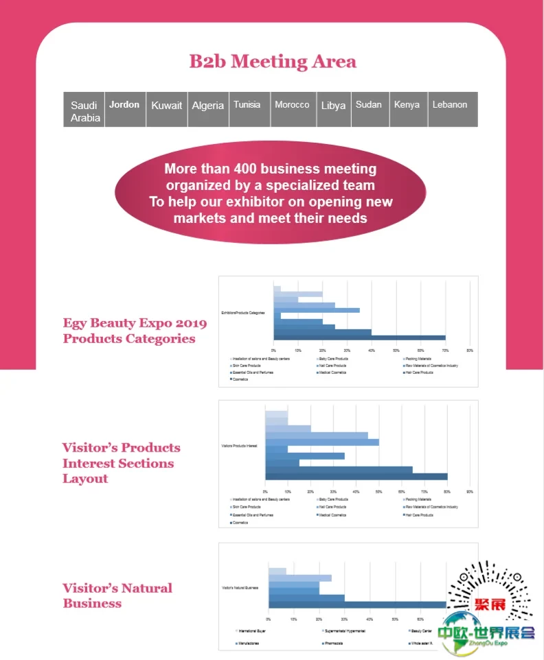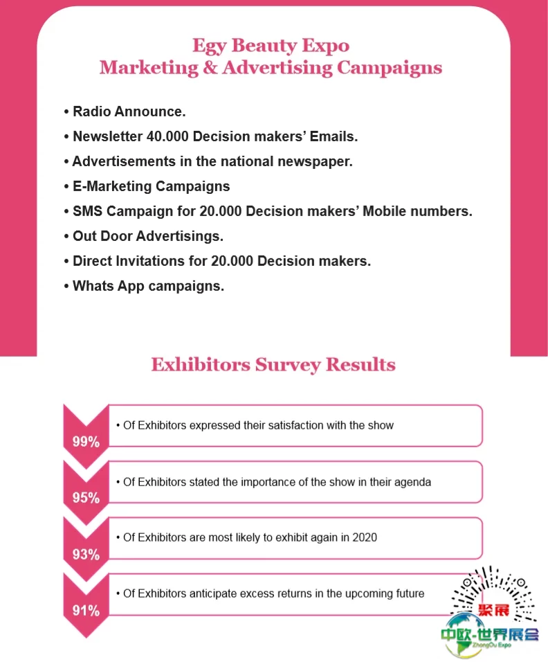 埃及美容及化妆品展-非洲美容展(Egy Beauty Africa)是埃及唯一一个集化妆品、专业美容和化妆品技术供应商的展览。在这里你可移与成千上万的前来参观的分销商、批发商、零售商、沙龙老板、发型设计师、化妆师、美容和临床中心以及前来参观的买家见面洽谈,在展会上还可移体验新的产品和技术。