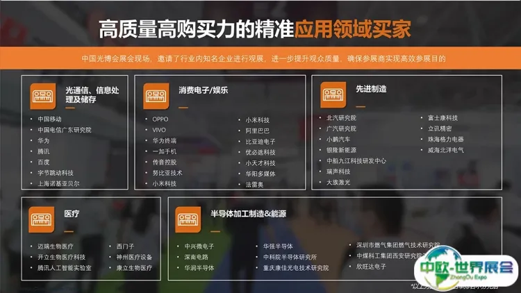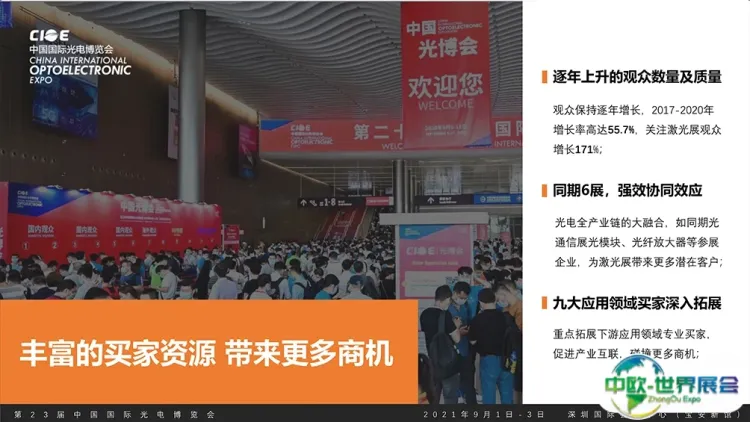 深圳精密光学、镜头及摄像模组展CIOE同期举办中国光博会CIOE,紧贴市场发展,细分观众数据实现精准营销匹配资源,展示前沿智能制造技术及创新综合解决方案。覆盖光通信、激光、红外、精密光学、光电创新、军民融合、光电传感、数据中心等光电产业链版块。