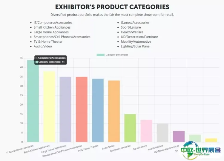 消费类电子产品:电视机及家庭影院、视听及影像产品、扬声器、耳机、音响、电子礼品、电子书、各种灯具、电子娱乐产品等;个人电子产品(保健及美容)、体育及娱乐产品、电子玩具、游戏机及相关产品、耳机、音箱、LED、健康、监控器等安全产品,移动电话、软件、硬件、智能通讯产品、卫星通讯技术、导航产品、摄影器材、IT及ICT、可穿戴设备、3D打印机、电子商务等