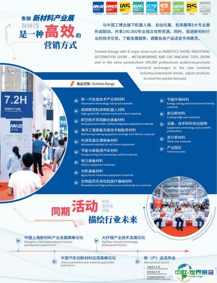 上海国际新材料产业展NMIS将充分利用中国工博会在先进装备制造领域的平台优势,整合石油化工、机器人、信息技术、新能源、汽车、航空航天、轨道交通、船舶制造、国防军工等产业链上下游资源,汇聚全球材料领先企业,集中展示顶尖材料技术在先进装备制造领域的应用成果,打造一个全球材料产业应用的新平台。
