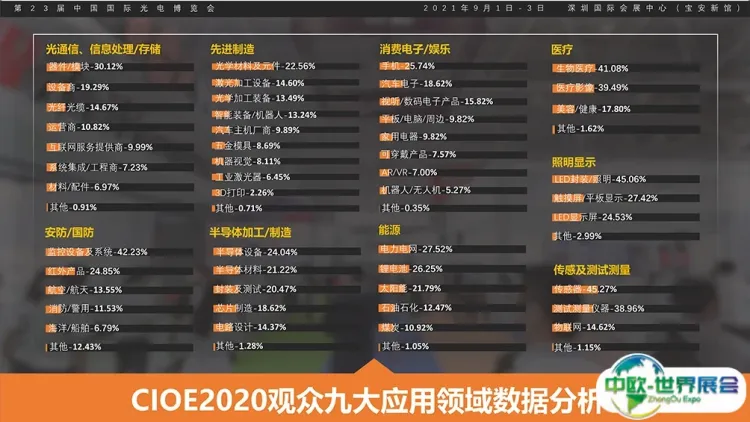 深圳光电子创新展CIOE同期举办中国光博会CIOE,紧贴市场发展,细分观众数据实现精准营销匹配资源,展示前沿智能制造技术及创新综合解决方案。覆盖光通信、激光、红外、精密光学、光电创新、军民融合、光电传感、数据中心等光电产业链版块。