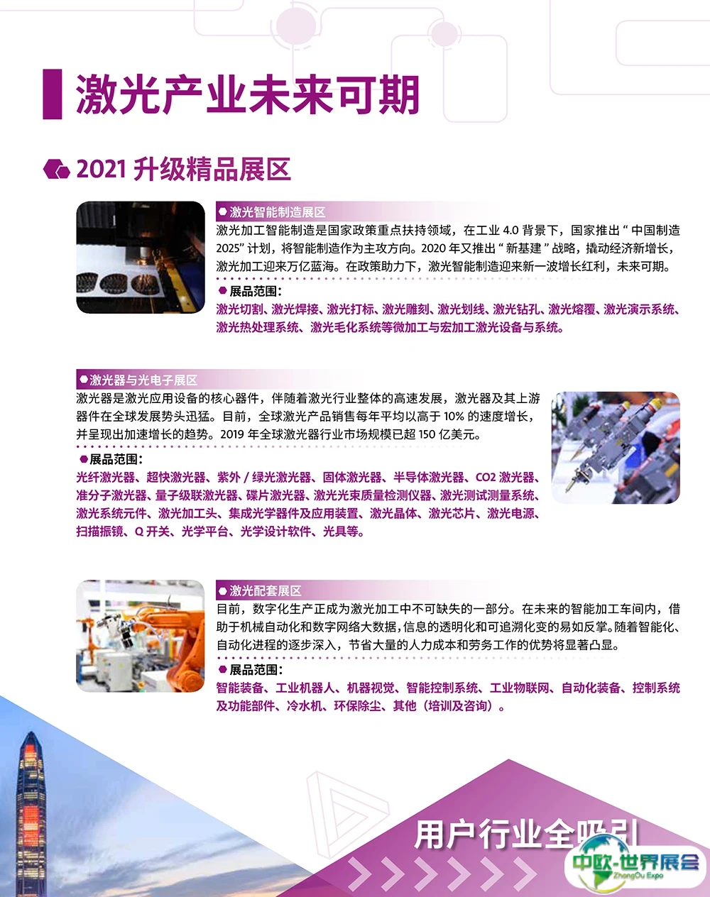 激光器与光学材料及元器件 : 新型激光器、光纤激光器、超快激光器、紫外/ 绿光激光器、固体激光器、半导体激光器、CO2 激光器、准分子激光器、量子级联激光器、碟片激光器、激光光束质量检测仪器、激光测试测量系统、激光系统元件、激光加工头、集成光学器件及应用装置、 激光晶体、激光芯片、激光电源、扫描振镜、Q 开关、光学平台、光学设计软件、光具等;激光其他应用 : 医疗应用、舞美景观应用、军民融合