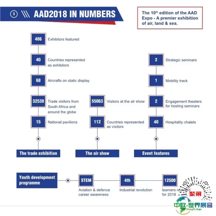 南非开普敦航空及国防展AAD展出了当今最先进的军事和民用航空技术,共吸引了包括波音、空客在内的展商参展,各种机型不但有波音、空客民用机型,更引人注目来自各国的军用飞机和枪械等。中国除了官方军工企业组团参加,也有部分特殊车辆、航空模型、军用服装鞋帽、防护防弹产品等周边企业参加。
