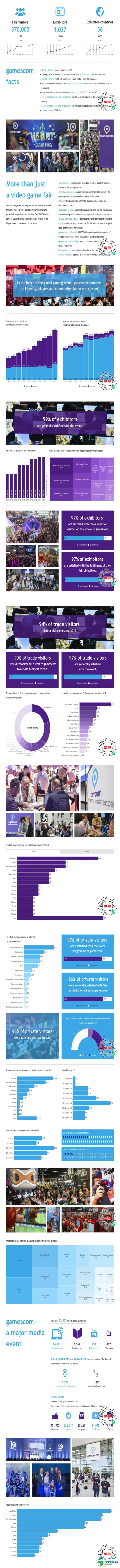德国科隆游戏展览会(Gamescom)上届展会总面积201000平方米,参展企业919家均来自中国、中国台湾、日本、韩国、意大利、美国、迪拜、巴西等,参展人数达355000人。国内著名游戏企业如完美世界、趣游科技、成都博瑞梦工厂等公司在科隆国际游戏展中国文化贸易展区整体亮相。