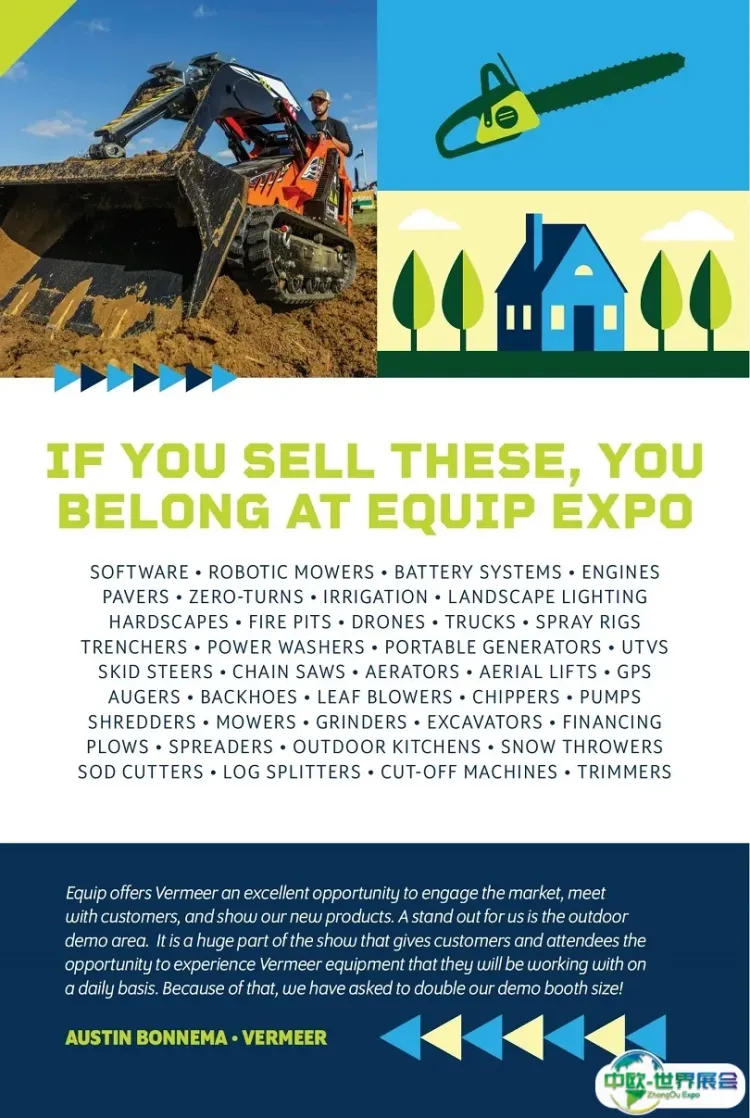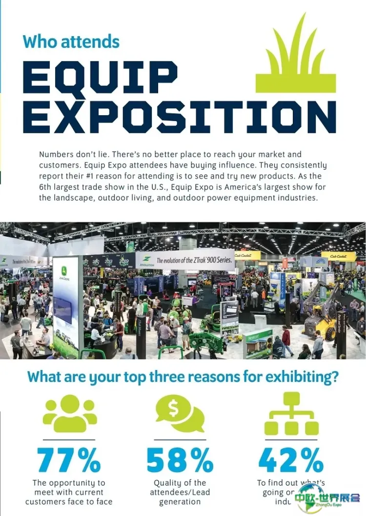 美国路易斯维尔园林机械展览会(equip exposition)上届展会总面积60000平方米,参展企业900家均来自中国、日本、印度、澳大利亚、墨西哥、智利、巴西、俄罗斯、挪威、西班牙、新加坡等,参展人数达35000人。在展会上你可以看到世界著名的公司如Honda、Kawaski、Briggs & Stration、Echo、Kohler、Shindaiwa、Husquvarna、Stihl、Kybota、Toro等知名公司参展。
