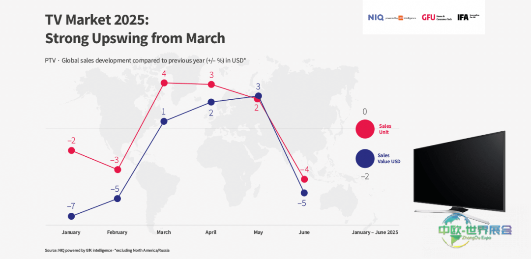 全球电视市场在2025年正焕发新生机。年初开局缓慢后,三月的营收增长成为转折点,全球收入发展态势已超越2024年同期。但前七个月美元总营收仍同比下降1.6%¹。