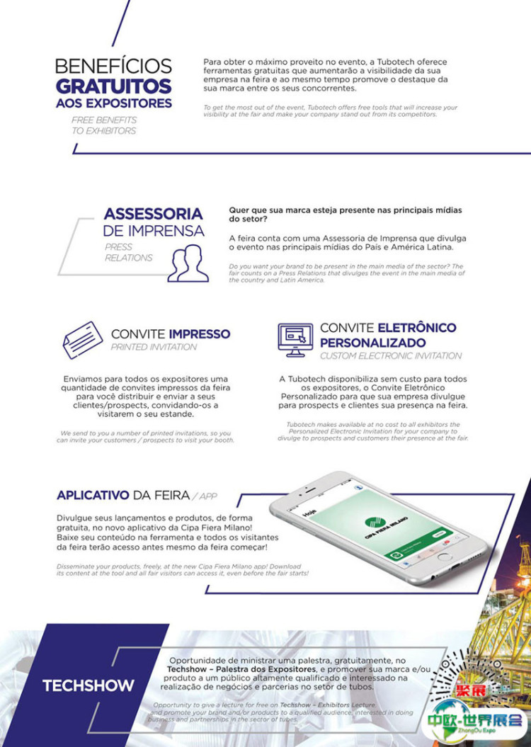 中欧国际多次组织了部分优质企业参展!巴西圣保罗管材展览会(Tubotech)将展出最新的 产品和服务,涉及管道、管道制造设备、原材料、测量和控制技术以及工艺技术工具、二手机械和试验设备。该展以规模大、专业性强、覆盖面广,是全球管材和线材行业最具规模和影响力的行业盛会。