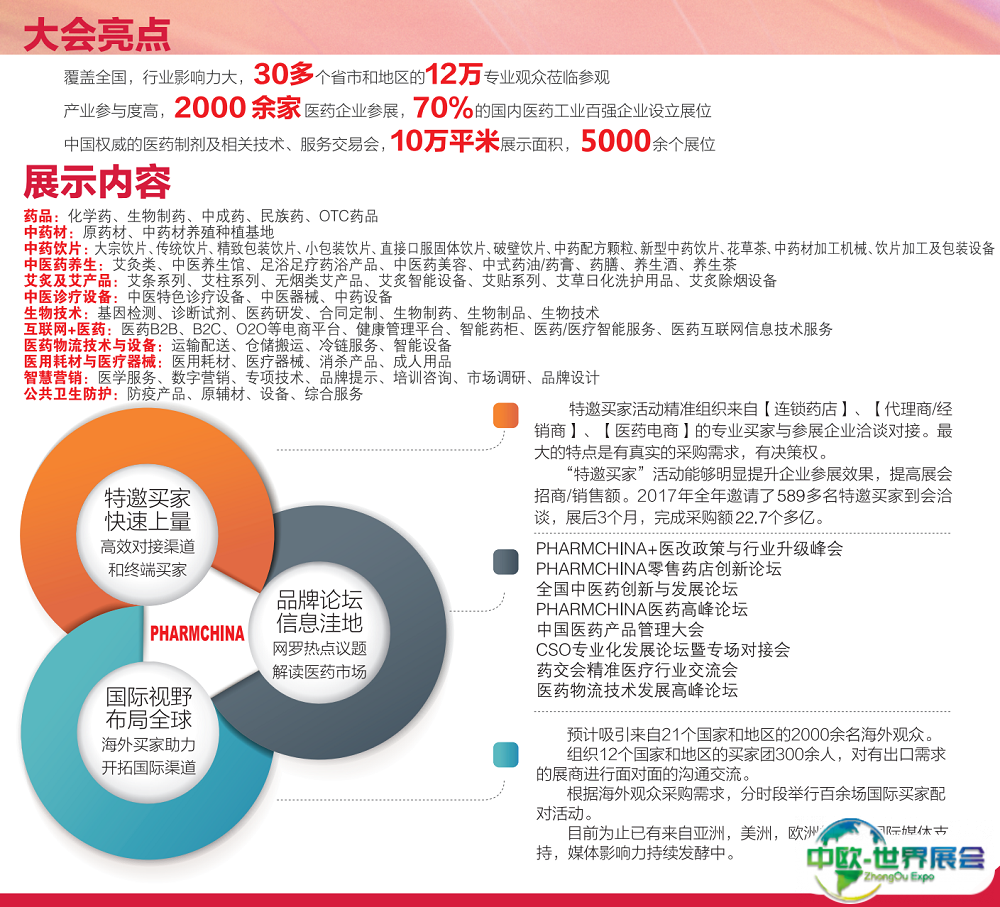 广州药交会-全国药品交易会(PHARMCHINA)本届展会展出产品涵盖化学药、中成药、中药饮片、配方颗粒、OTC药品、医用耗材、医疗器械、中医诊疗及中医药设备、个人护理用品、成人用品、医美融合产品、医药研发供应链、医药物流技术与设备、互联网+医药、智慧营销等细分产业集群,"专区专展"的展出模式极大程度地凝聚目标观众。