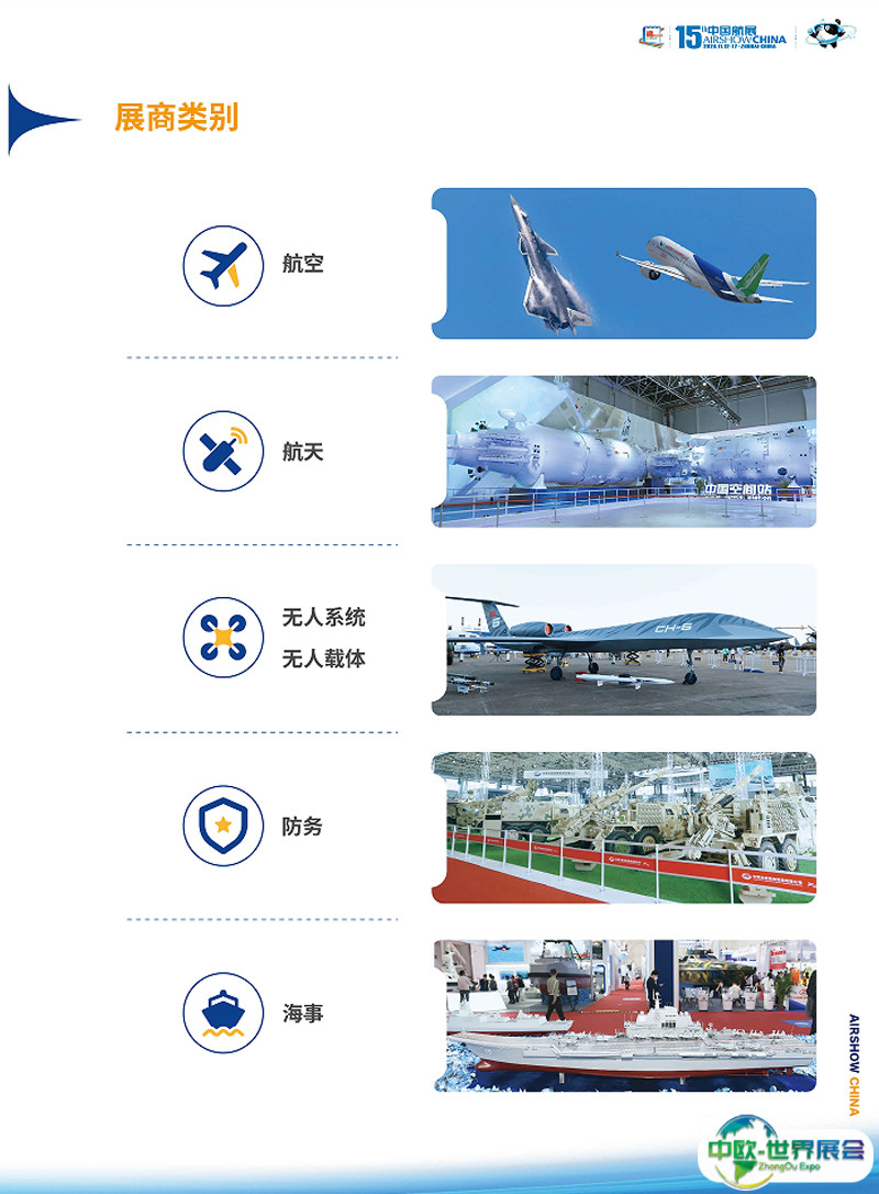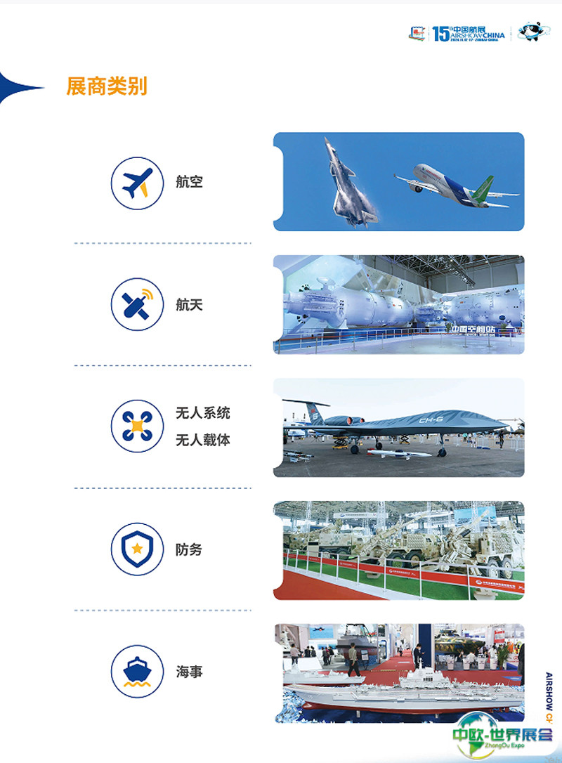 中国国际航空航天博览会-珠海航展(AIR SHOW CHINA)是我国唯一由中央人民政府批准的国际航空航天展。由广东省人民政府、国防科学技术工业委员会、中国民用航空总局、中国国际贸易促进委员会、中国航空工业第一集团公司、中国航空工业第二集团联合举办。来自全球的参展商参观商可以分享宝贵的新产品知识和经验,肆意展开贸易洽谈和技术交流,从产品订购,到方案设计,乃至行业前沿探讨。