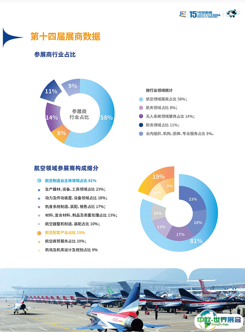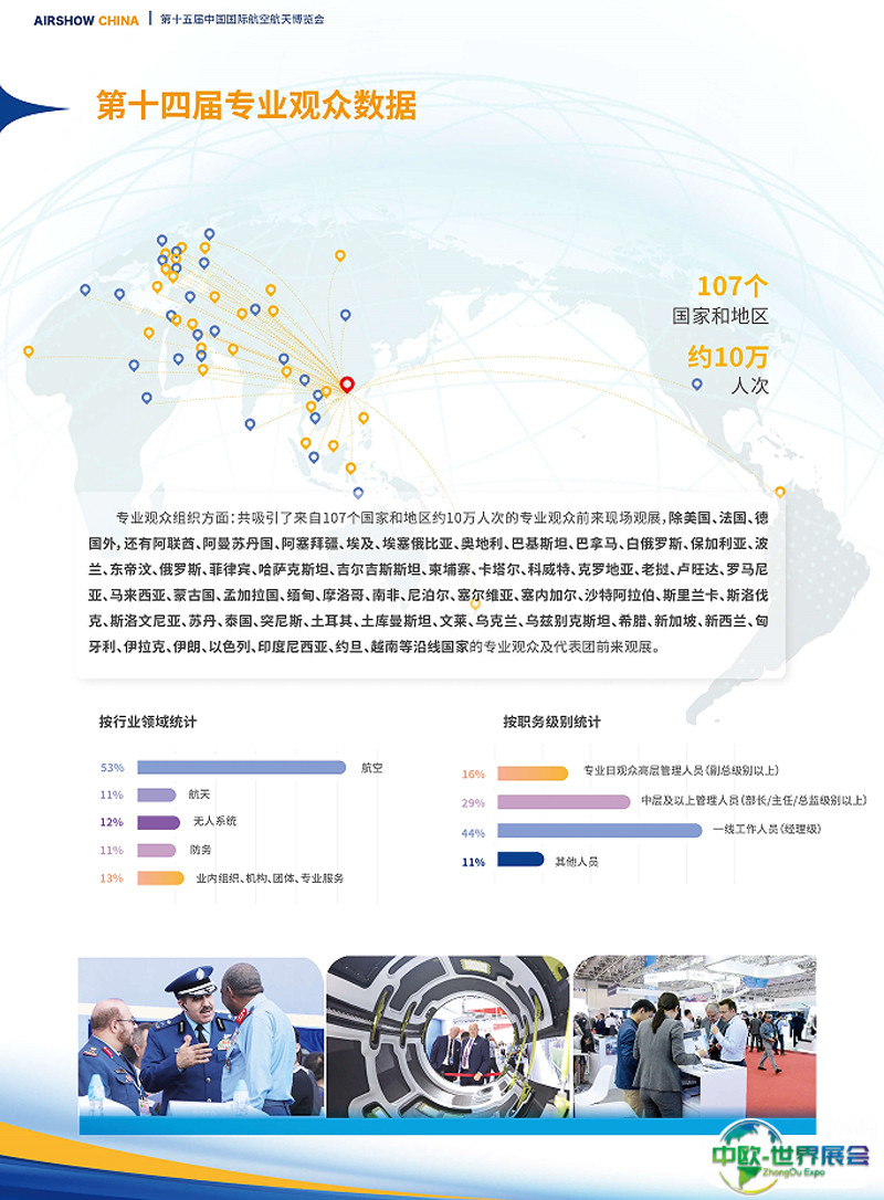 中国国际航空航天博览会-珠海航展(AIR SHOW CHINA)将启用13个展馆,室内展览面积达12万平米,较上届增长了20%;室外展览面积约23万平米;首次开辟“无人系统演示区”,含“无人船演示区”和“无人机演示区”;参展国家和地区47个,国内外参展商近800家。其中俄罗斯、法国、美国、沙特将以展团形式参展,波音、空客、霍尼韦尔、巴航工业、赛峰、泰雷兹等世界知名航空企业悉数亮相。