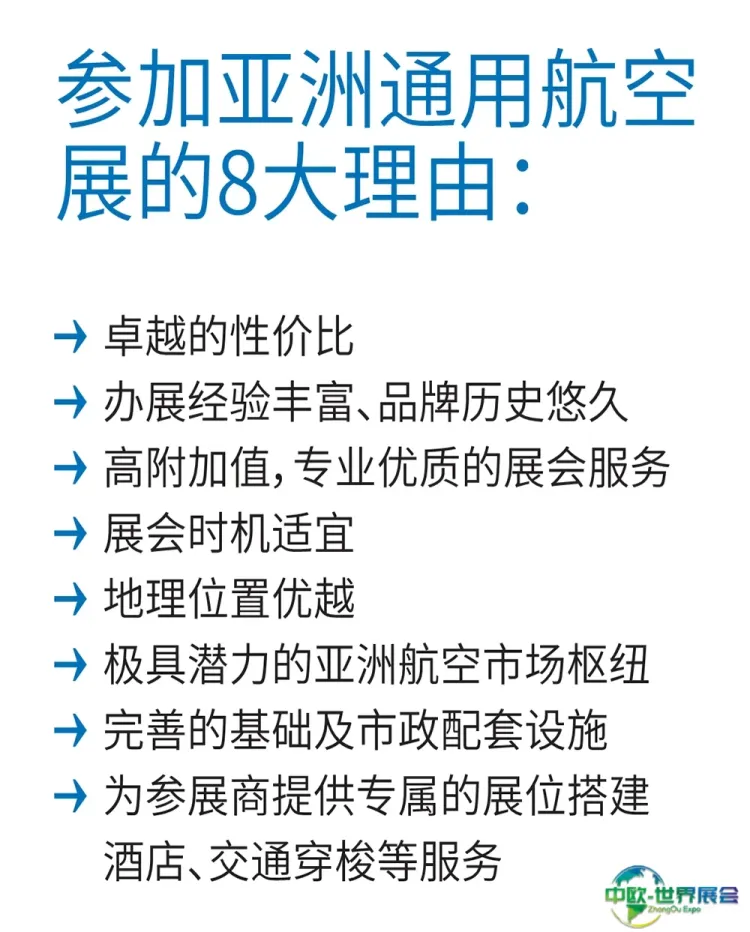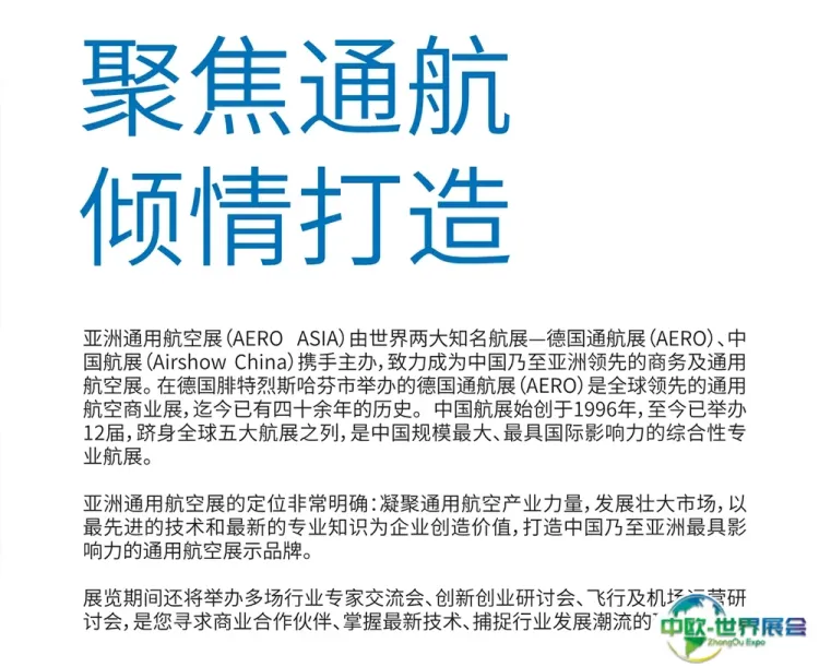 2025珠海亚洲通用航空展在线预定展位 中欧国际为您呈现展位图、展位报价、参展商名单、会刊申请、邀请函申请、门票预定、签证服务、展位搭建等。想了解更详细资料,请联系我们~