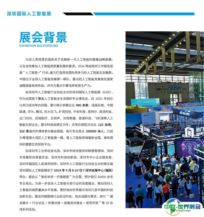 深圳国际人工智能展(GAIE)聚焦人工智能热点技术和行业新发展;聚焦行业最具创新力标杆性企业;涵盖全产业链的国际化人工智能展示、交易、对接的专业服务平台,是全国最具影响力的人工智能展会。