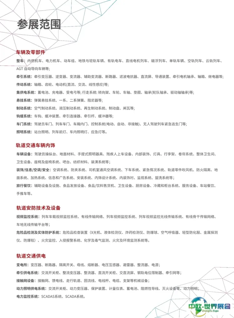车辆及零部件:整车:内燃机车、电力机车、动车组、地铁与轻轨车辆、有轨电车、直线电机列车、磁浮列车、单轨车辆、AGT 自动导向车辆等;牵引系统:牵引变压器、逆变器、变流器、辅助变流器、断路器、滤波电抗器、直流屏、导通装置、牵引电机轴承、轴箱、继电器等;传动系统:轴箱、齿轮、电动机(直流、交流、线性感应)等;集供电系统:蓄电池、充电器、受电弓等;行走系统:转向架、车轮、车轴、垫圈、轴承(轮队轴承、驱动轴轴承)等;悬挂系统:弹簧悬挂系统、一系、二系弹簧、阻尼器等;制动系统:空气制动系统、液压制动系统、再生制动系统、制动盘、闸瓦等;钩缓系统:车钩、缓冲装置、牵引连接器、牵引杆、缓冲器等;车门系统:驾驶员车门、列车车门、车厢内门、控制系统(电动、自动、非接触)、无人驾驶列车紧急逃生门等;照明系统:列车前灯、车内照明灯、应急灯等