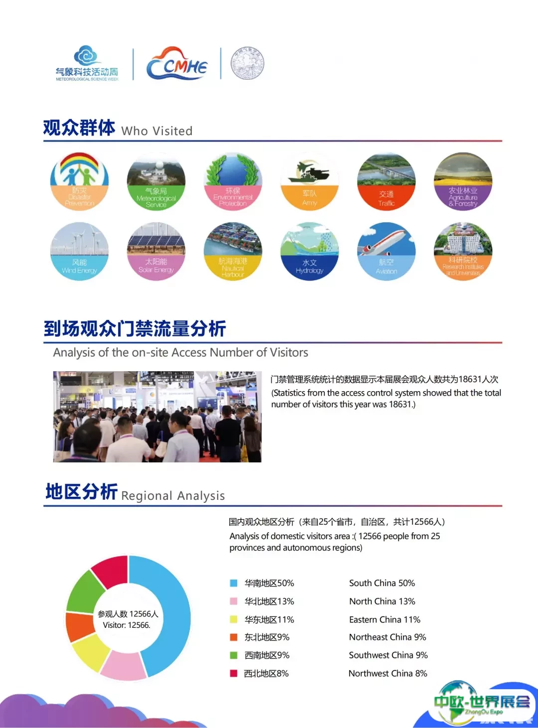 中国气象科技展CMHE EXPO上届展会总面积30000平方米,参展企业560家,参展人数达32000人。除中国展商外,日本、新加坡、韩国和中东地区的买家及经销商,也专程来华参观洽谈贸易合作。