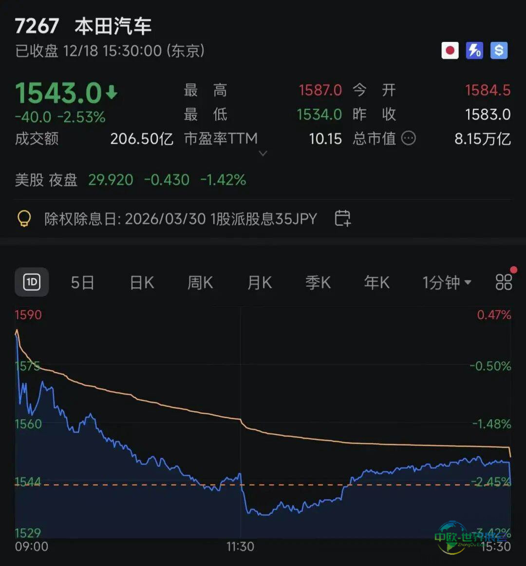 二级市场上,截至18日收盘,日本股市本田股价下跌2.53%,报收1543日元,最新市值为8.15万亿日元。