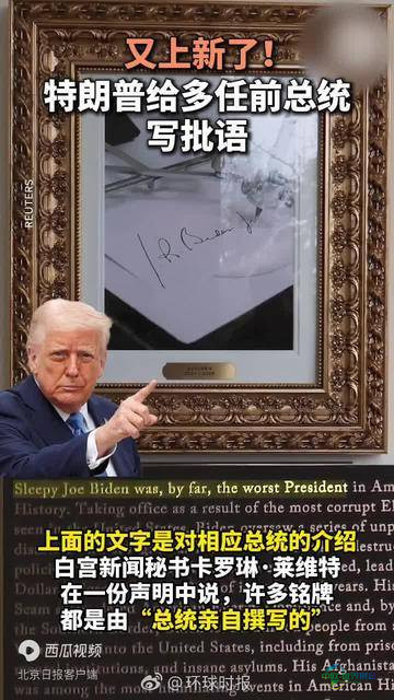 根据美国广播公司18日的消息,美国总统特朗普在之前设立的白宫西翼柱廊的历任总统肖像下方,最新增设了铭牌,上面刻有对各位总统的简介。白宫新闻秘书卡罗琳·莱维特在一份声明中表示,不少铭牌内容是由“总统本人亲自执笔完成的”。