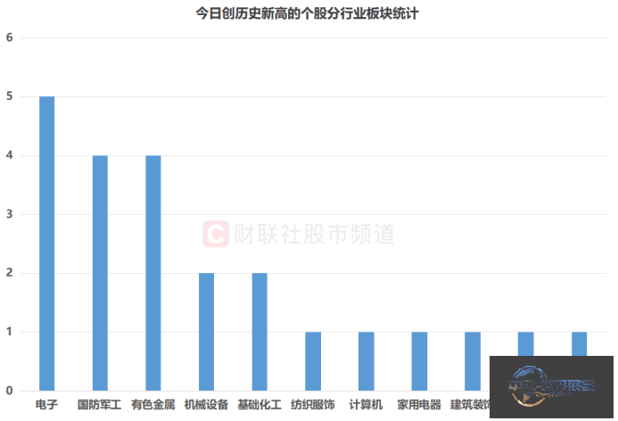 除了合富中国,不计新股,今日还有20多只股票在盘中股价创出历史新高。按行业板块(申万一级)划分,属于电子、国防军工、有色金属、机械设备、基础化工的个股数量相对较多,占比分别达到21.7%、17.4%、17.4%、8.7%、8.7%,合计占比接近74%。同时,这些股票还涉及纺织服饰、计算机、家用电器、建筑装饰、轻工制造、医药生物等行业。