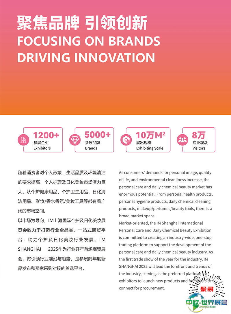 上海国际个护及日化美妆展览会(IM)打造个护及日化行业一站式商贸平台。以市场需求为导向,IM致力于为上下游专业人士搭建多样化的商贸需求,助力个护及日化美妆行业发展。IM引领行业前沿与趋势,将成为展商年度新品发布和买家采购对接的优质平台。