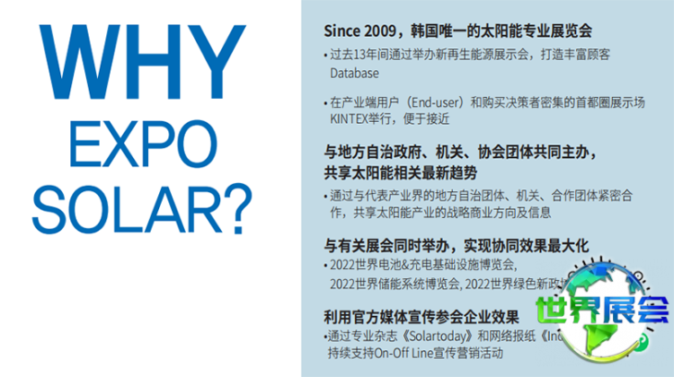 本资讯由中欧世界展会网编辑整理。我们是一个汇聚全球展会时间地点、门票购买、展位申请、设计搭建服务的平台,为您提供韩国太阳能展的展位预订服务。