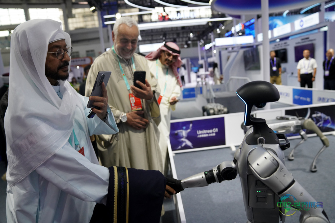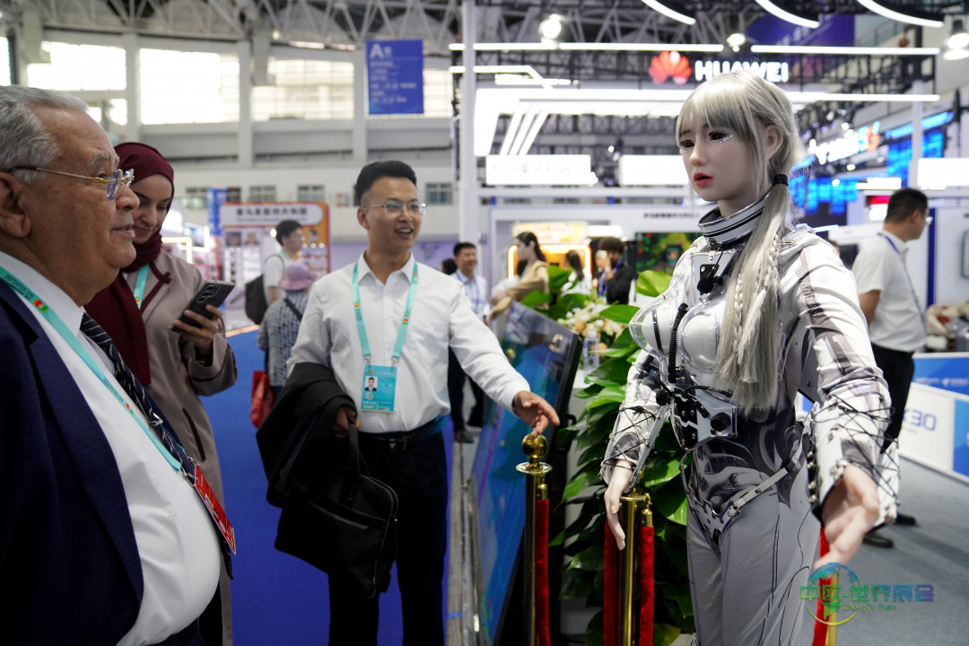 8月28日,与会嘉宾在第七届中国—阿拉伯国家博览会上与一台机器人进行对话互动。新华社记者 赵宇思 摄
