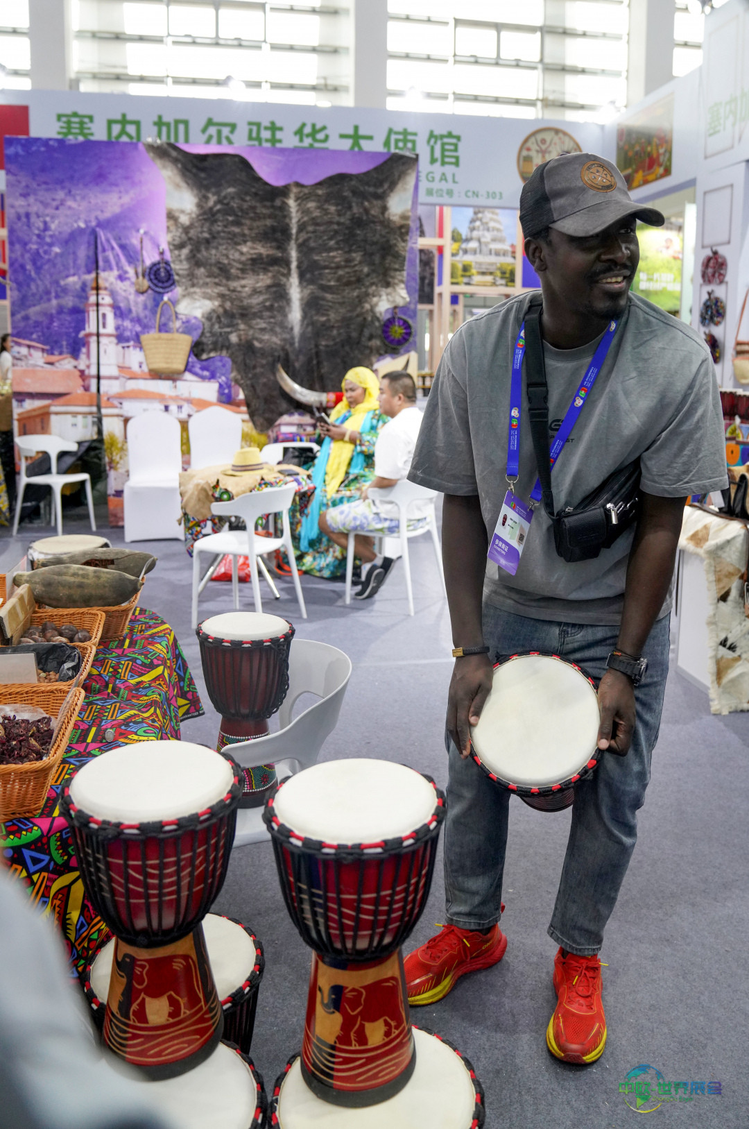 8月28日,塞内加尔参展商在第七届中国—阿拉伯国家博览会现场为观众演奏非洲鼓。新华社记者 赵宇思 摄