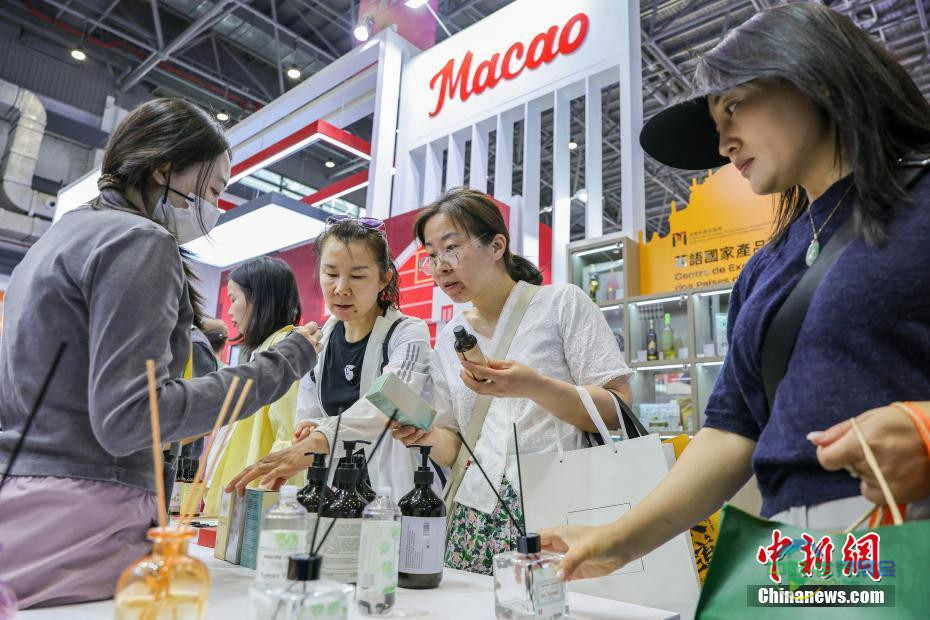 4月18日,第五届中国国际消费品博览会(简称“消博会”)于海南海口闭幕。本届消博会汇聚了71个国家和地区的1767家企业与4209个品牌,专业采购商超过6万人,规模为历史之最。图为参观者在澳门馆内挑选商品。中新社记者 骆云飞 摄