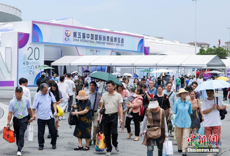 4月18日,在海南海口举办的第五届中国国际消费品博览会(简称“消博会”)正式落下帷幕。本次展会汇集了来自71个国家和地区的1767家企业和4209个品牌,吸引了超过6万名专业采购商,其规模创下了历届新高。图为收获满满的观众们正有序离开会场。中新社记者 骆云飞 摄
