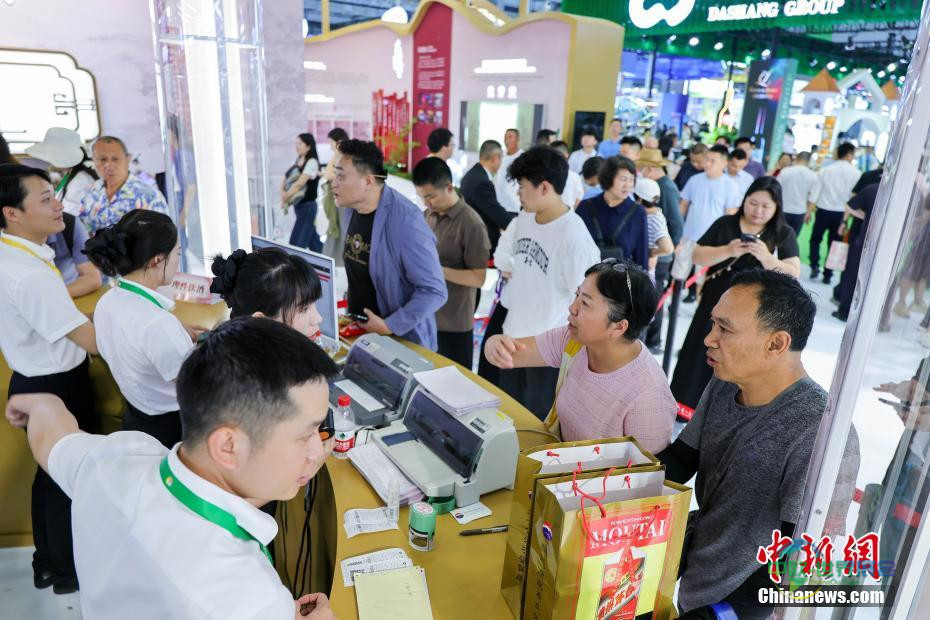 4月18日,第五届中国国际消费品博览会(简称“消博会”)在海南海口闭幕。本届展会吸引了71个国家和地区的1767家企业、4209个品牌参与,专业采购商突破6万人,规模为历届最大。图为民众在茅台展馆前排起长队购买茅台酒。中新社记者 骆云飞 摄