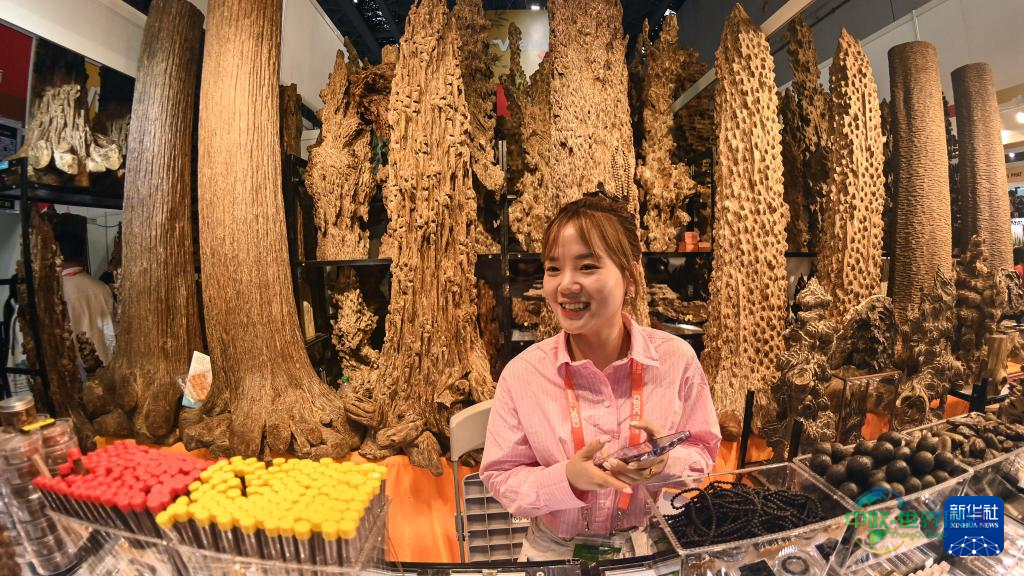 9月24日,在南宁国际会展中心的越南展馆,一位参展商正在推介沉香木制品。
