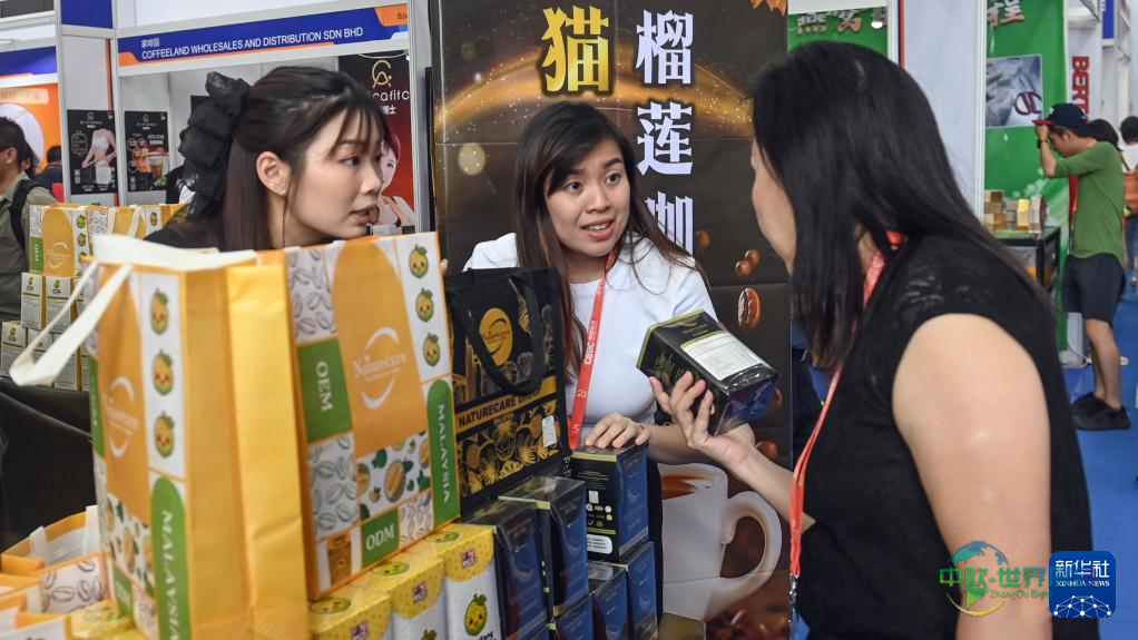 9月24日,在南宁国际会展中心的马来西亚展区,一位女士正在挑选榴莲咖啡。