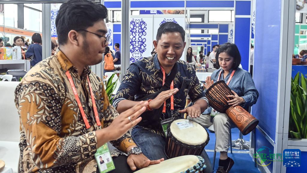 9月24日,位于南宁国际会展中心的柬埔寨展馆内,参展商通过敲击手鼓来招揽参观者。