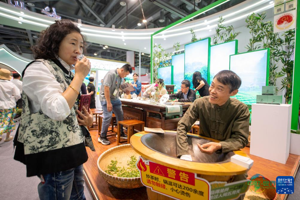 5月17日,参观者在第六届中国国际茶叶博览会现场品尝茶水。