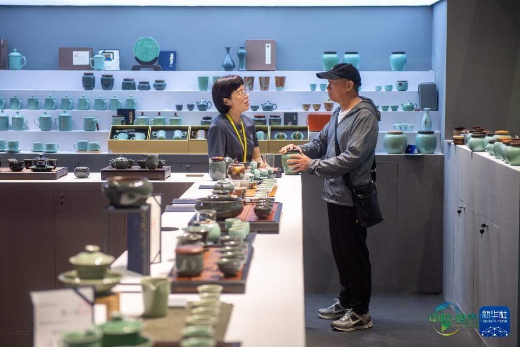 5月17日,参观者在第六届中国国际茶叶博览会上挑选茶具。