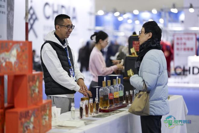 12月26日,展位工作人员(左)正向参观者介绍黄酒产品。新华社记者 王翔 摄